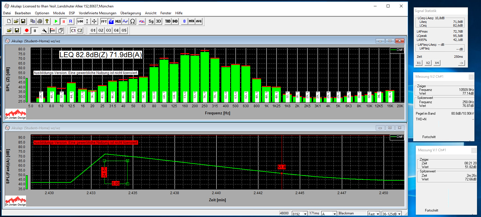 Diese Aufnahme beinhaltet ein Poltern mit einem Pegel von 65 db(A), ungefähr eine Minute nach Beginn der Aufnahme. Es war zu dieser Zeit niemand zu Haus, ich habe mit der Software AutoIt dafür gesorgt, dass alle 10 Minuten eine neue Pegelmessung gestartet wird. Die Mittelungszeit liegt bei 125 ms.